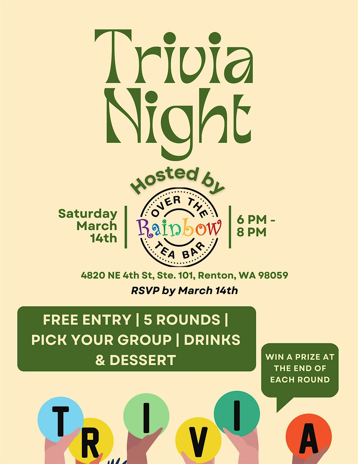 🕕 Doors open at 6:00 PM 🎯 5 rounds, 10 questions each 👥 Teams of 2 to 4 players 🏆 One winning team per round takes home an OTR drink coupon 📍 Over The Rainbow Tea Bar — Renton location