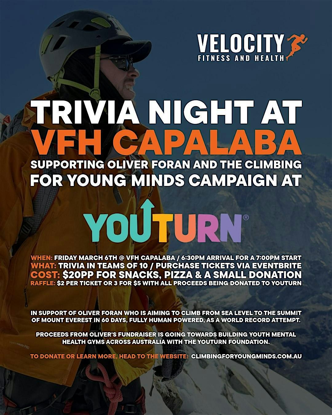 Join us for a fun-filled evening supporting Oliver Foran and the Climbing For Young Minds Campaign at YouTurn. In April this year, Oliver will set off on an extraordinary journey to break a world record, aiming to become the fastest person to travel from sea level to the summit of Mount Everest — all within 60 days.
