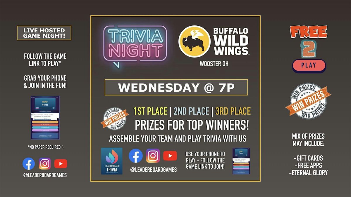 Trivia Game Night at Buffalo Wild Wings - Wooster OH every Wednesday at 7pm! Test your knowledge, compete for prizes, and enjoy a fun-filled evening of trivia and laughter with your team. Get your best team together, use your phone to play and compete to win prizes!