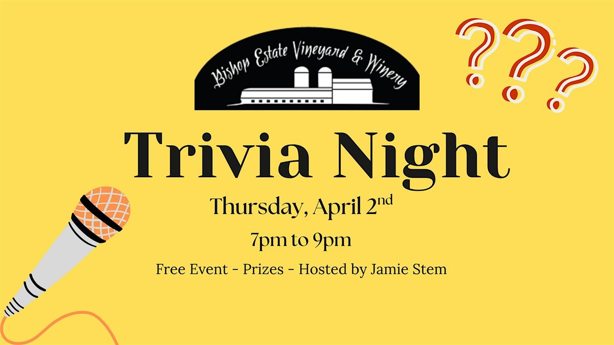 Join us for a fun-filled evening of brain-teasing questions and delicious wine at Bishop Estate Vineyard and Winery hosted by Jamie Stem. Test your knowledge on a variety of topics while sipping on our exquisite wines. Gather your friends and family for a memorable night of laughter and friendly competition.