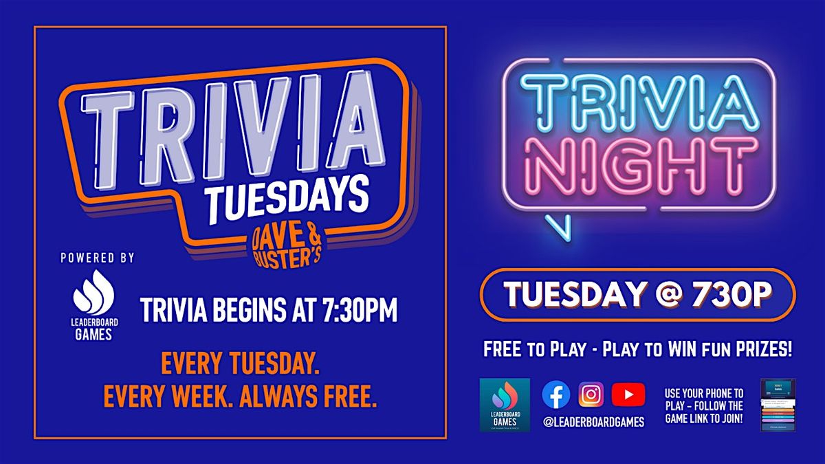 Join us for an exciting Trivia Night and fun at Dave & Buster's in Freehold NJ every Tuesday at 730p! Put your knowledge to the test and compete against fellow trivia enthusiasts in our action-packed trivia game event. FREE to Play but you have to Play to WIN PRIZES!!!