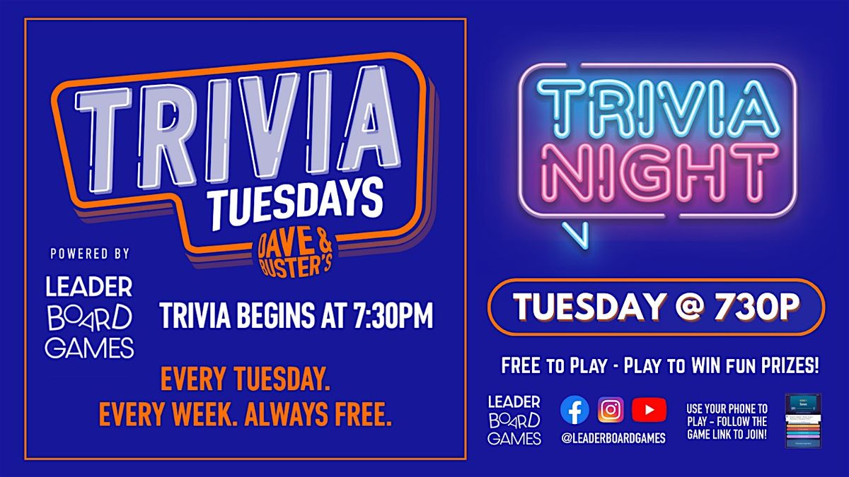 Join us for an exciting Trivia Night and fun at Dave & Buster's - Killeen TX every Tuesday at 730p! Put your knowledge to the test and compete against fellow trivia enthusiasts in our action-packed trivia game event. Free to Play but you have to Play to WIN!