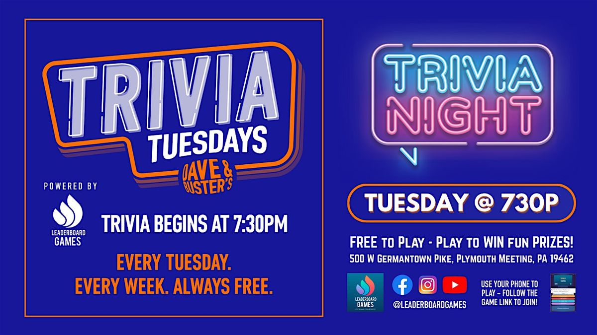 Join us for an exciting Trivia Night and fun at Dave & Buster's - Plymouth Meeting PA every Tuesday at 730p! Put your knowledge to the test and compete against fellow trivia enthusiasts in our action-packed trivia game event. Free to Play but you have to Play to WIN!