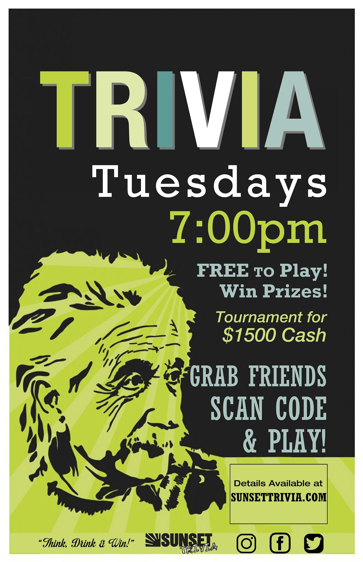 Gather your top thinkers 🧠& drinkers🍻 and join us every Tuesday Evening, 7:00 pm at The Rack Scottsdale! Enjoy a fun-filled event where you get to test your knowledge over food and drinks while competing for prizes! Think, Drink, and Win with us at Sunset Trivia every Tuesday night. See you this week!