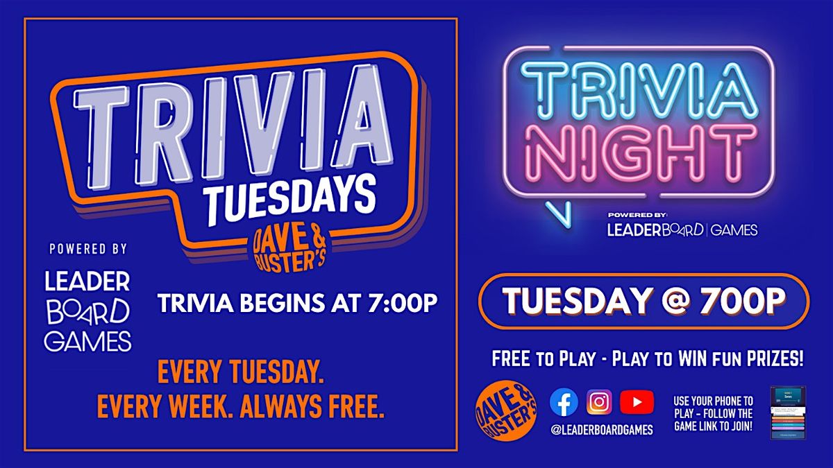 Join us for an exciting Trivia Night and fun at Dave & Buster's - Fort Myers FL every Tuesday at 700p! Put your knowledge to the test and compete against fellow trivia enthusiasts in our action-packed trivia game event. Free to Play but you have to Play to WIN!