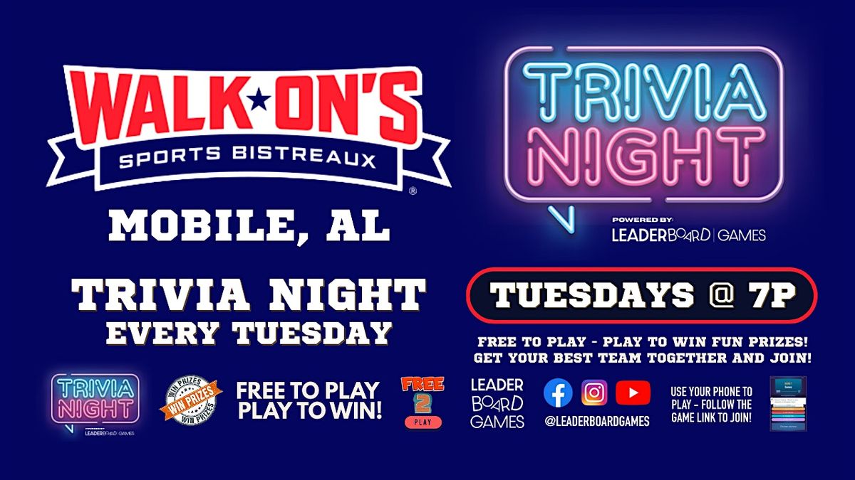 Join us for an exciting Trivia Game Night at Walk-On's Sports Bistreaux - Mobile AL every Tuesday at 7p! Test your knowledge, compete with friends, and win amazing prizes. Don't miss out on this fun-filled evening of trivia and laughter. Grab your team and get ready to show off your smarts! FREE to Play - Have to Play to WIN PRIZES!