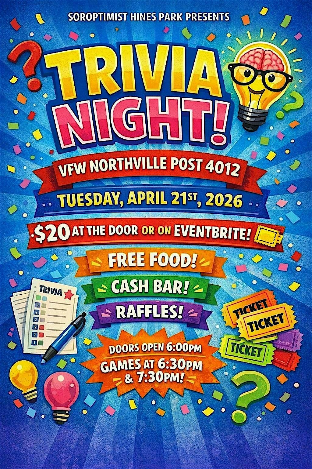 There will be 2 trivia games at 6.30pm and 7.30pm. Food will be provided and there will be a cash bar available. We will also have raffle drawings going on throughout. This is always a fun event and tickets sell out fast! Come support a good cause!
