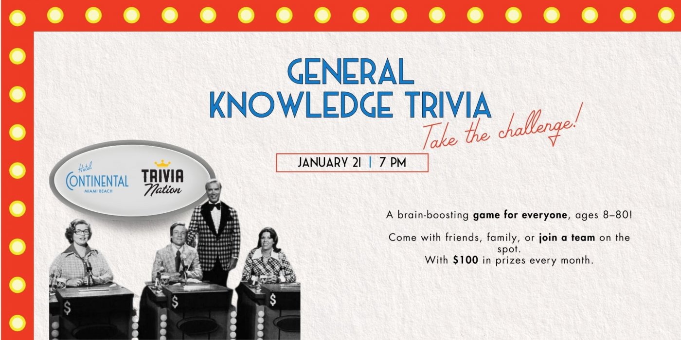 Put your thinking cap on and head to Hotel Continental Miami Beach for General Knowledge Trivia hosted by Trivia Nation on Wednesday, January 21 at 7 p.m. Designed with a Jeopardy! and Trivial Pursuit vibe and questions for all ages, this lively showdown is perfect for friend groups, coworkers, families or solo players ready to join a team on the spot. Even better: There’s $100 in prizes up for grabs each month, plus drinks and bites available from Divebar, the hotel’s self-pour standout, with happy hour pricing until 8 p.m. Set in the newly renovated Hotel Continental, a 1948 Mid-Beach gem blending retro-chic design with modern comforts, trivia night is your excuse to make a weeknight feel like a mini getaway. Tickets are free and open to the public. Reserve your spot https://www.eventbrite.com/e/general-knowledge-trivia-at-hotel-continental-miami-beach-100-in-prizes-tickets-1980022750347?aff=ebdsshcopyurl&utm-campaign=social&utm-content=attendeeshare&utm-medium=discovery&utm-term=listing&utm-source=cp