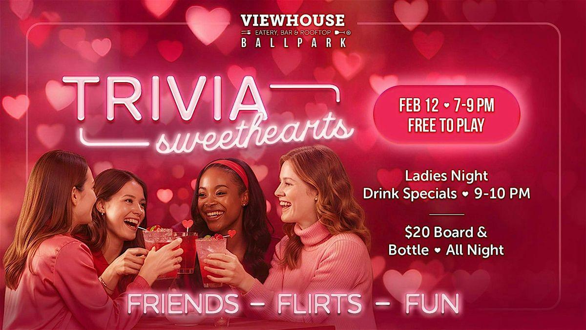 Live-hosted trivia gets a Valentine’s twist at Trivia Sweethearts at ViewHouse Ballpark! Grab your favorite plus-one or your best friends and test your knowledge of rom-coms and Valentine’s fun facts in this themed edition of Trivia Thursdays. 💕🧠