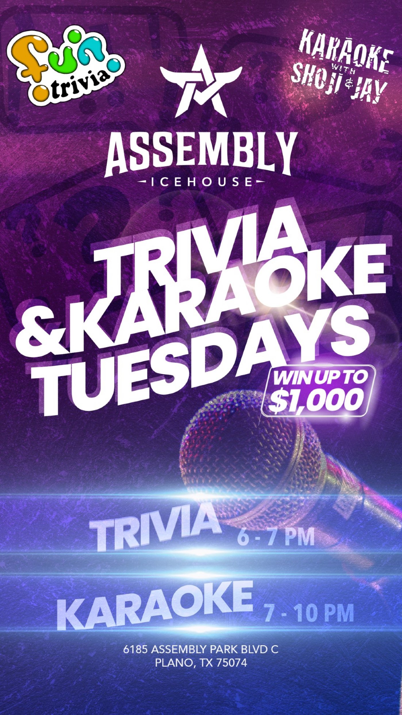 Trivia Tuesday and Karaoke Night (with Shoji & Jay) at Assembly Icehouse sports bar.