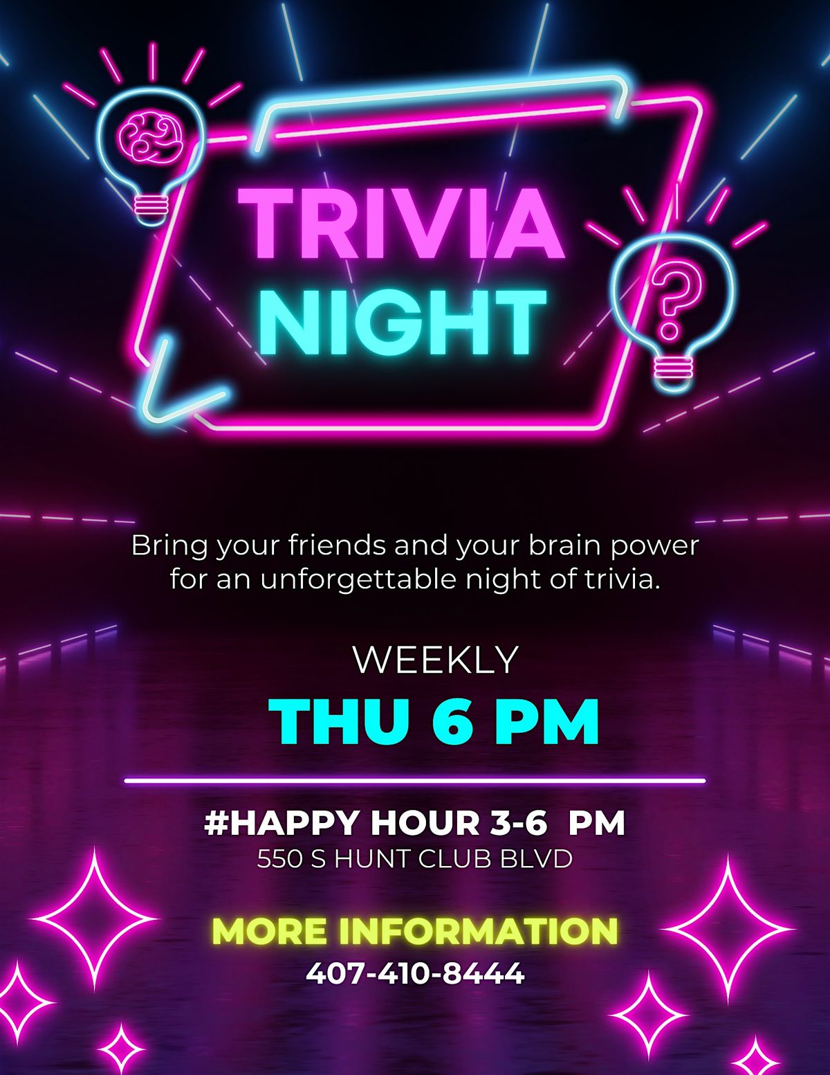 Join us for fun rounds of general trivia, theme based rounds, audio/visual rounds, and more fun!
