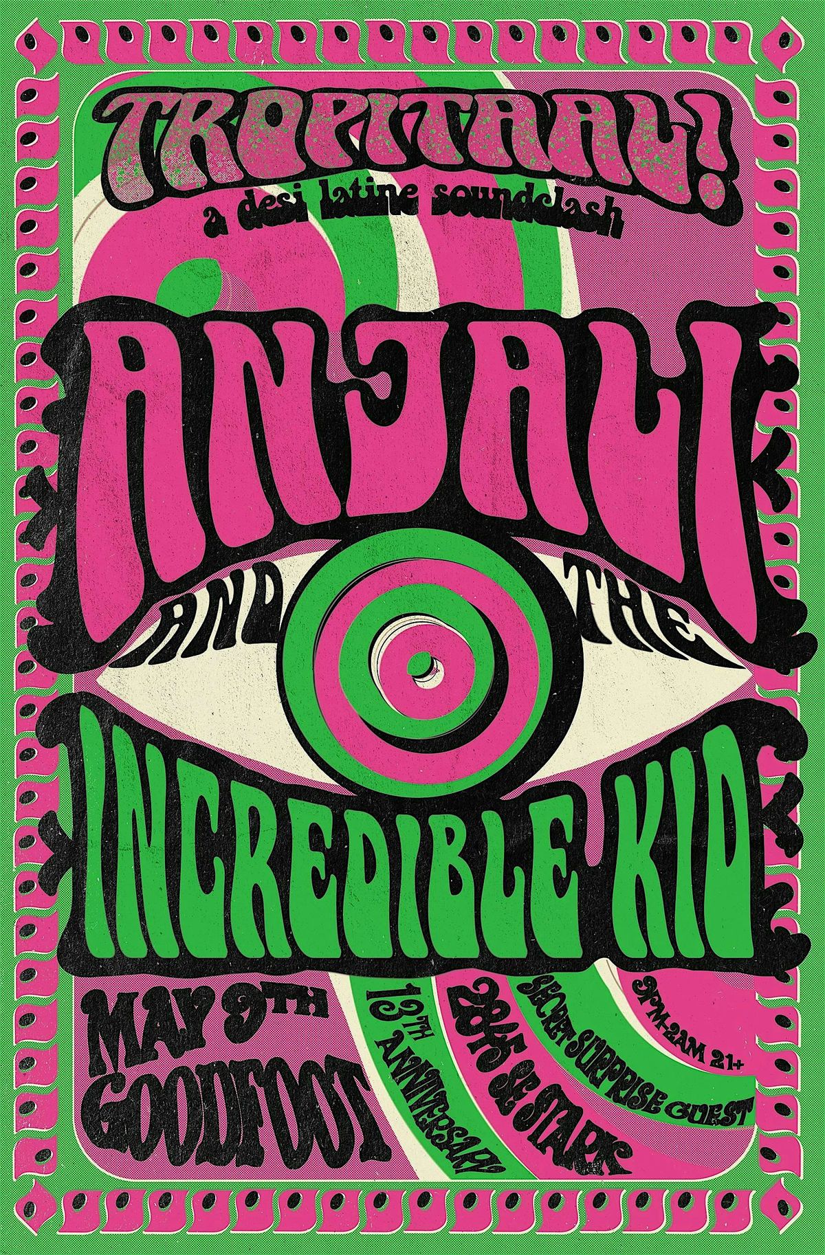 Take the sultry vibe of the Latin American Tropics, combine with the rhythm of India ("Taal") and stir into TROPITAAL! A Desi Latine Soundclash where the hottest club sounds from India and Latin America go head to head in an all-night dance-off of epic proportions. Resident DJs Anjali & The Incredible Kid combine their deep passions and deep crates from across the spectrum of Latin, Caribbean & South Asian vibes. Expect to hear a mix of Bhangra, Dembow, Future Filmi, Reggaeton, Baile Funk, Panjabi Rap, Trap & Drill, Moombahton, Electro Cumbia, Tribal Guarachero, Dancehall, Bollywood, Desi Bass & Global Bass party classics.