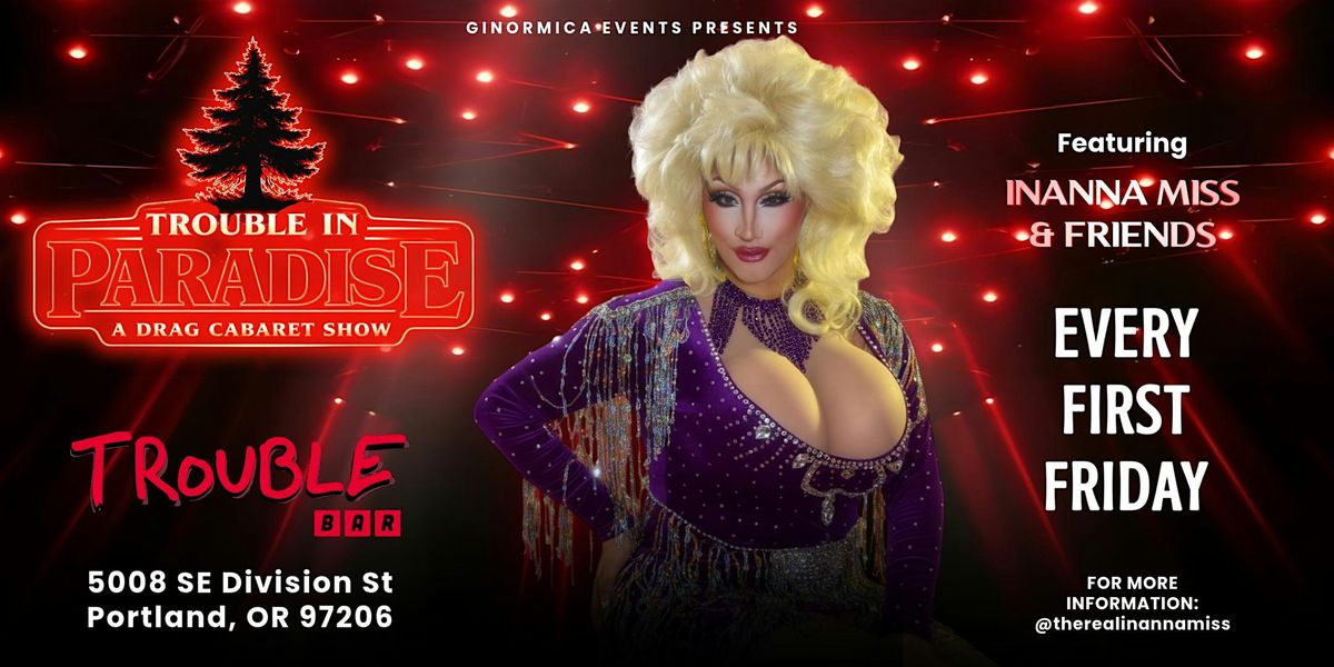 Trouble in Paradise is a monthly drag cabaret happening every First Friday, set inside Trouble Bar in Southeast Portland. Expect a diverse rotating lineup showcasing talented drag artists from across the PNW, polished performances, comedy with a hint of mischief, strong drinks, and a room where the rules are flexible and the fun is mandatory. Paradise found, trouble guaranteed.