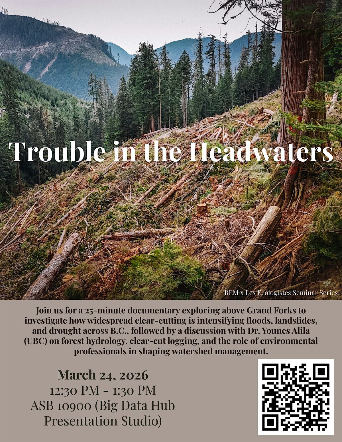 Trouble in the Headwaters is an important 25-minute documentary by filmmaker Daniel J. Pierce that explores the root causes of the devastating 2018 floods in Grand Forks, B.C. The Narwhal featured film follows Dr. Younes Alila, a professor of forest hydrology at the University of British Columbia, who investigates the upstream impacts of clear-cut logging on the hydrology of the Kettle River watershed. In this seminar, we will present the 25-minute documentary and then Dr. Younes Alila will lead us in a discussion about the impacts of clear-cut logging in British Columbia.