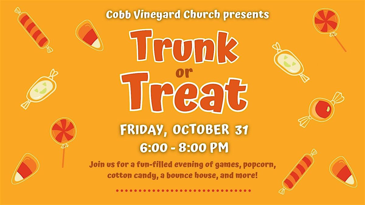 Join us for our annual Trunk or Treat Fall Festival! We will have bounce houses, games, prizes, popcorn, cotton candy and more!