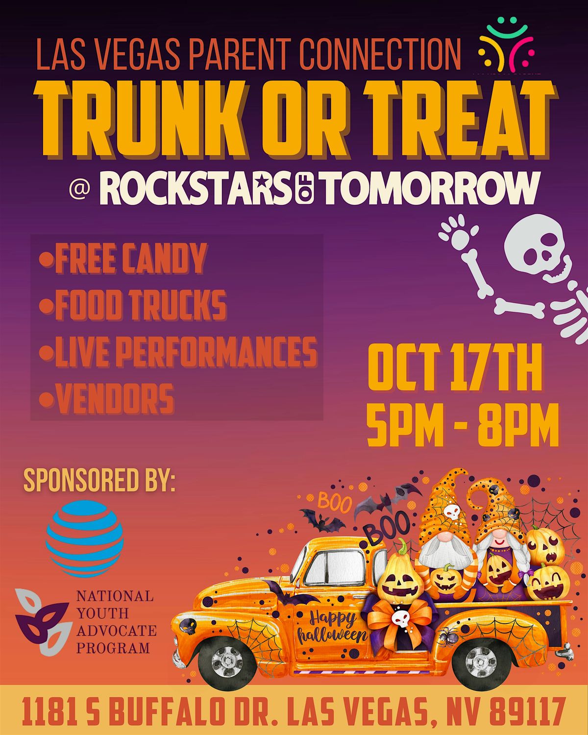 Calling all ghouls and goblins join Rockstars of Tomorrow for a spooky good time at our annual Trunk or Treat event!