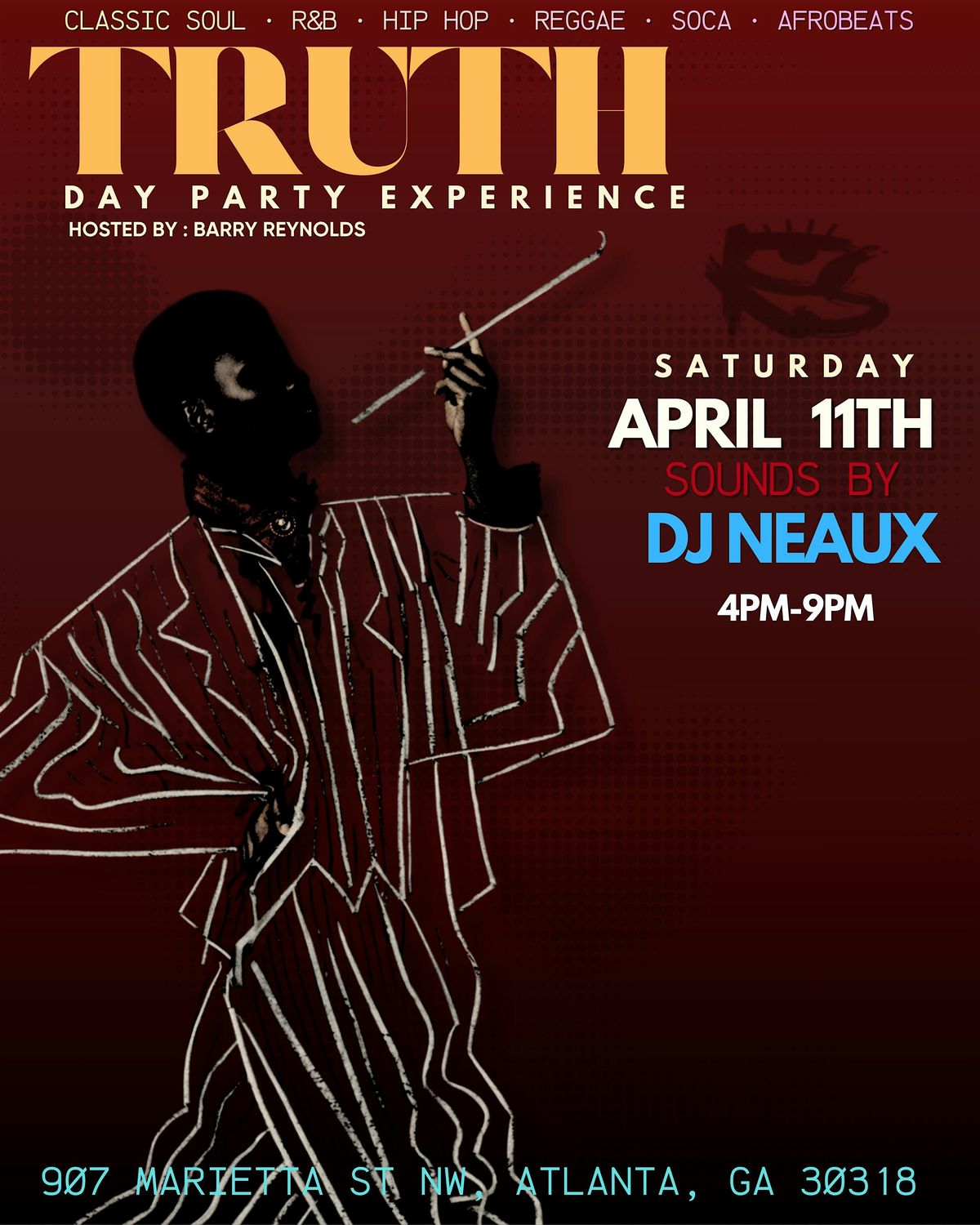 TRUTH - The Day Experience is an amazing event hosted and promoted by Atlanta's own Barry Reynolds with a proverbial (gumbo) mixture of hip hop, r&b, classic soul, reggae, soca & afrobeats by the incomparable DJ NEAUX. This event brings the sexy ambiance of Rock Steady's upstairs music gallery boasting an Afro-Carribean vibe with some of the best mixologists and sexiest vibes in the city of Atlanta. Bring out the grown, sexy and high energy for this one! Please remember this event is held Upstairs in the Music Gallery!