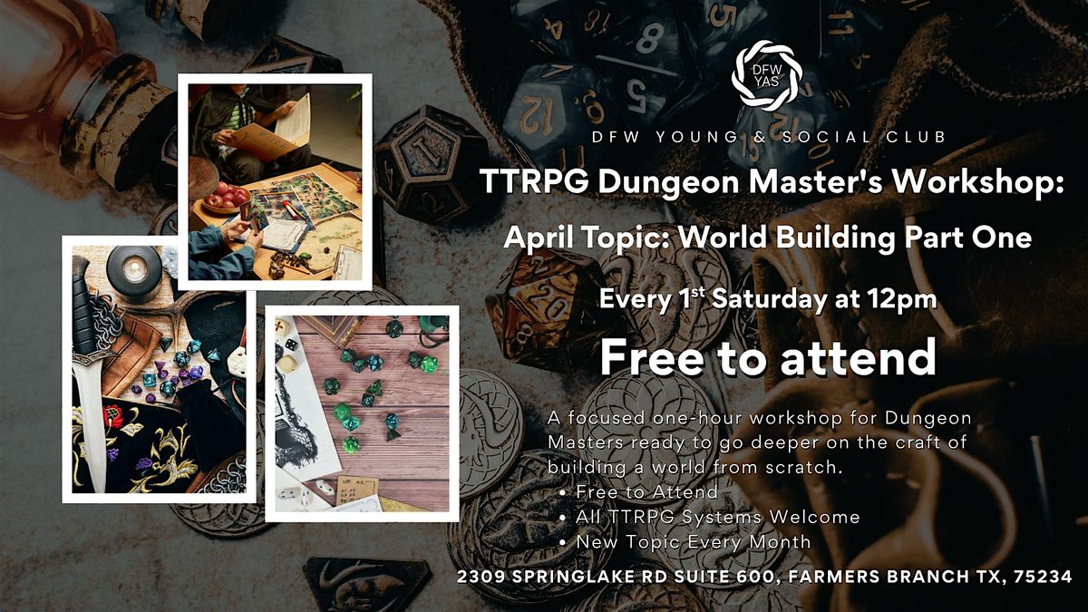 Led by DFWYAS House DM Andrew, this session covers the fundamentals of world design and gives you practical tools to bring back to your table. Whether you're brand new to DMing or have been running campaigns for years, there's something here for you.