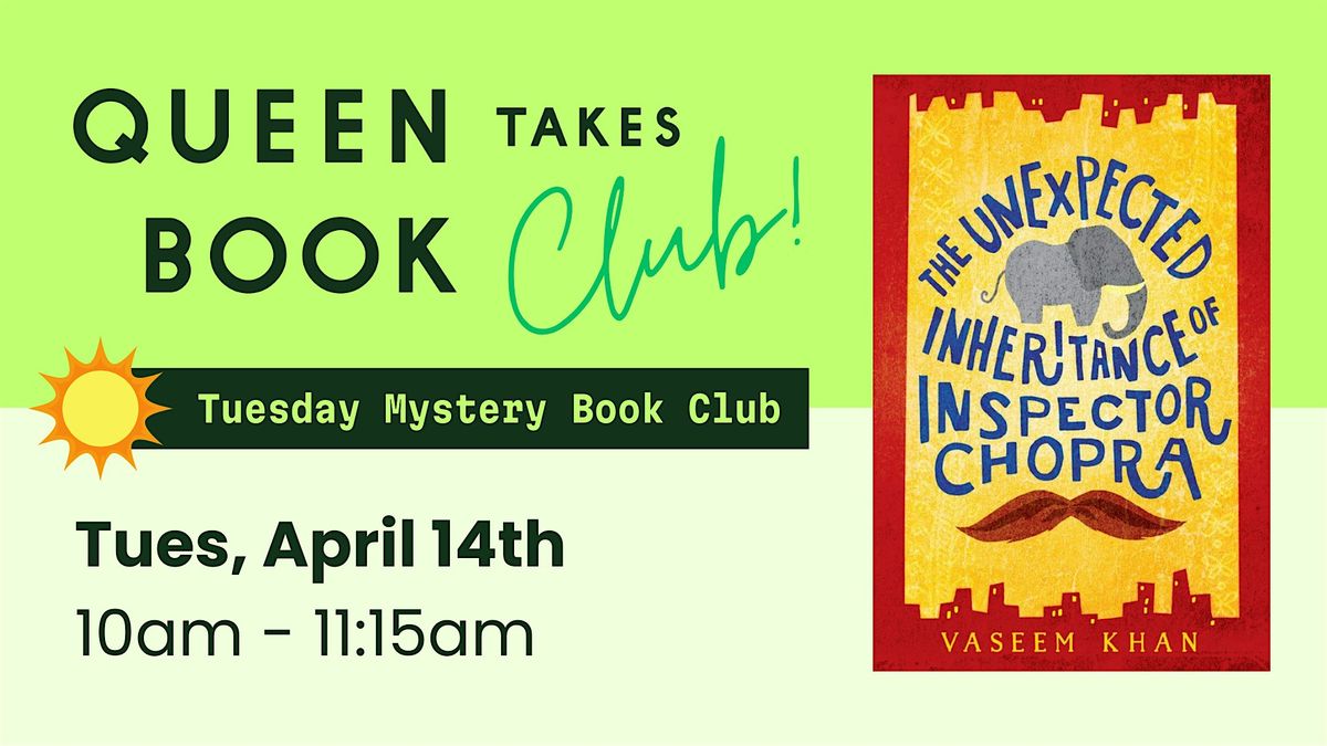 Join us for our Tuesday M**der Mystery book club on Tuesday, April 14th at 10am. This month, we'll be reading "The Unexpected Inheritance of Inspector Chopra" by Vaseem Khan.