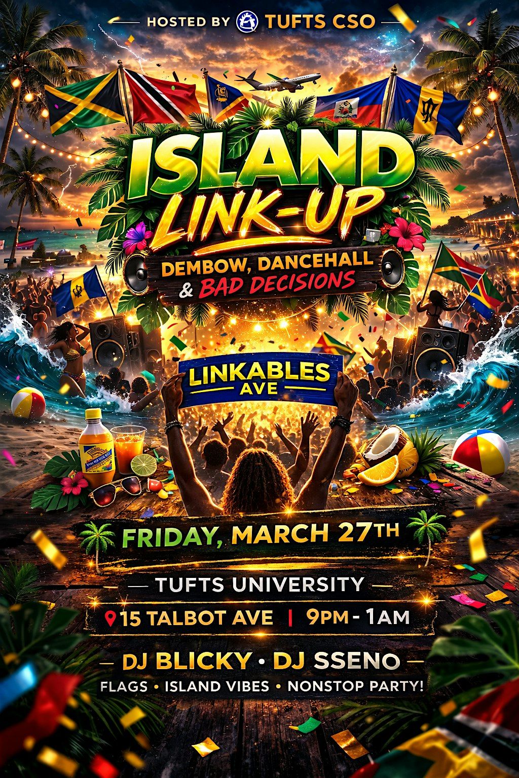 Join Tufts CSO for Island Link-Up: Dembow, Dancehall & Bad Decisions, a high-energy Caribbean party experience bringing together students from across campuses for one unforgettable night.
