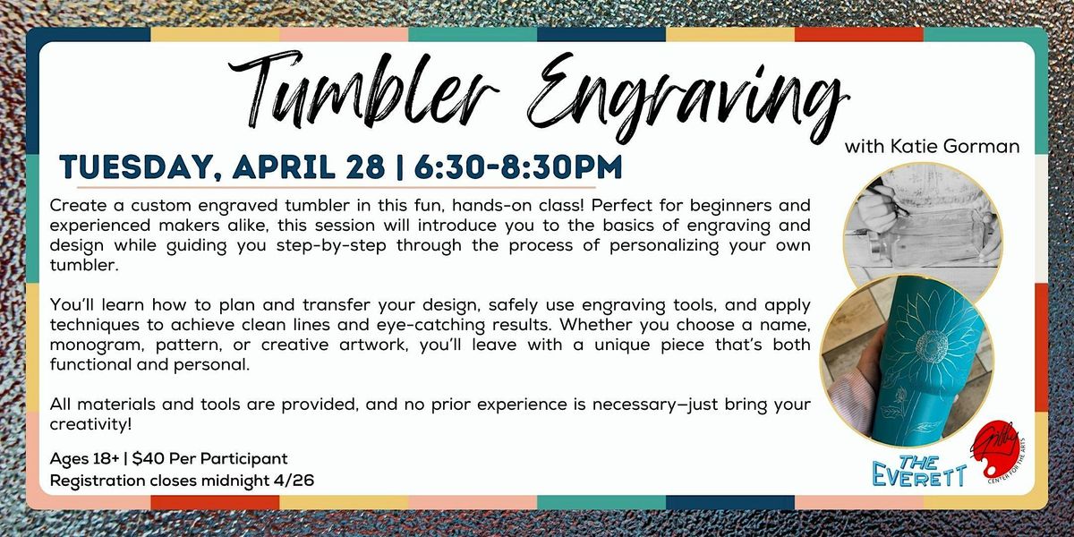 Perfect for beginners and experienced makers alike, this session will introduce you to the basics of engraving and design while guiding you step-by-step through the process of personalizing your own tumbler.