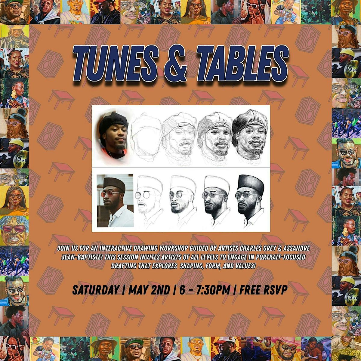 JOIN US FOR AN INTERACTIVE DRAWING WORKSHOP GUIDED BY ARTISTS ASSANDRE JEAN-BAPTISTE & CHARLES GREV, THIS SESSION INVITES ARTISTS OF ALL LEVELS TO ENGAGE IN PORTRAIT-FOCUSED DRAFTING THAT EXPLORES SHAPING, FORM, AND VALUES!