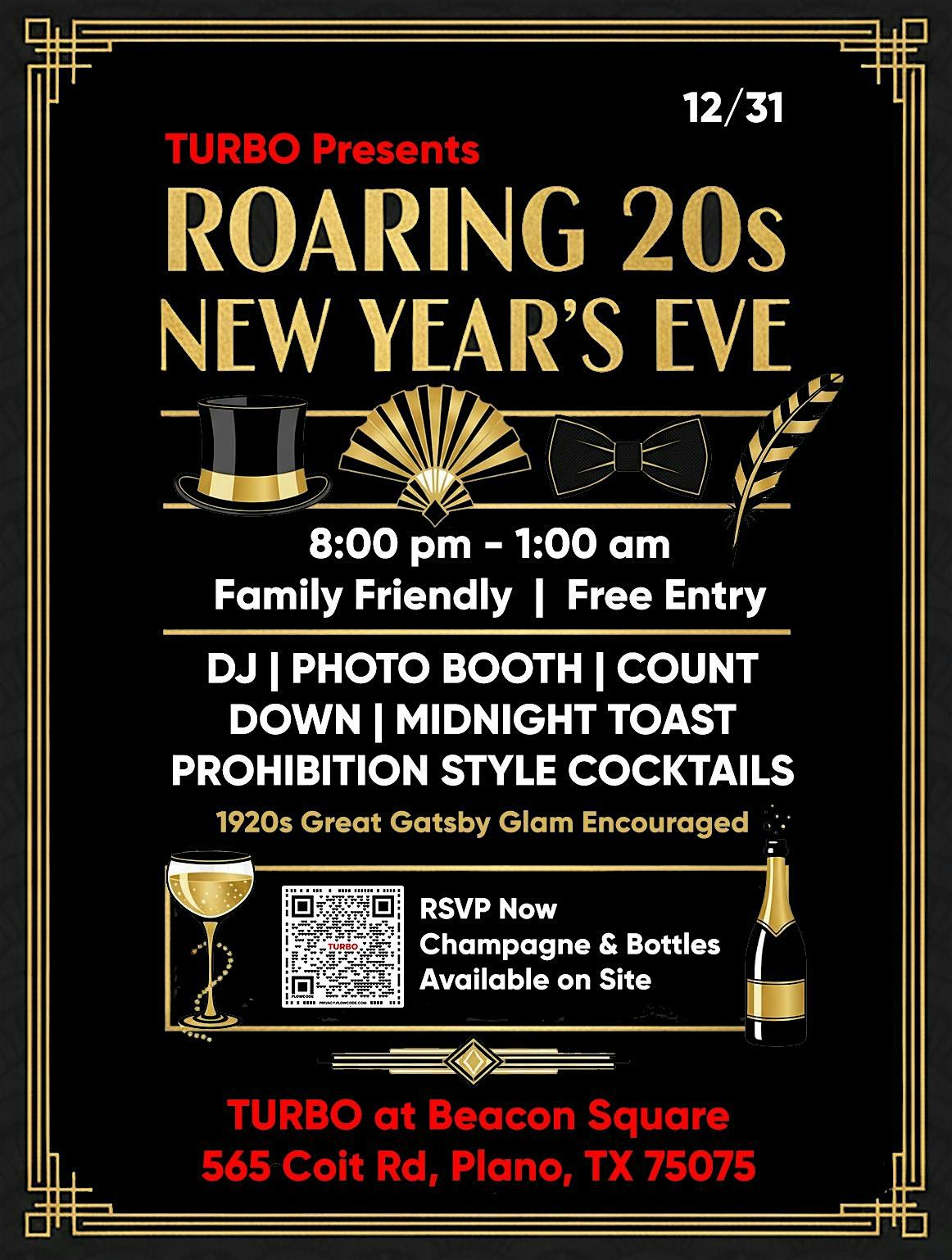 Step into the glamour of the Roaring 20s and ring in the New Year—speakeasy style. Join us at TURBO Plano for a family-friendly NYE celebration with great music, photo moments, and a midnight countdown you won’t forget. Plenty of seating downstairs and upstairs. Mix and Mingle environment.