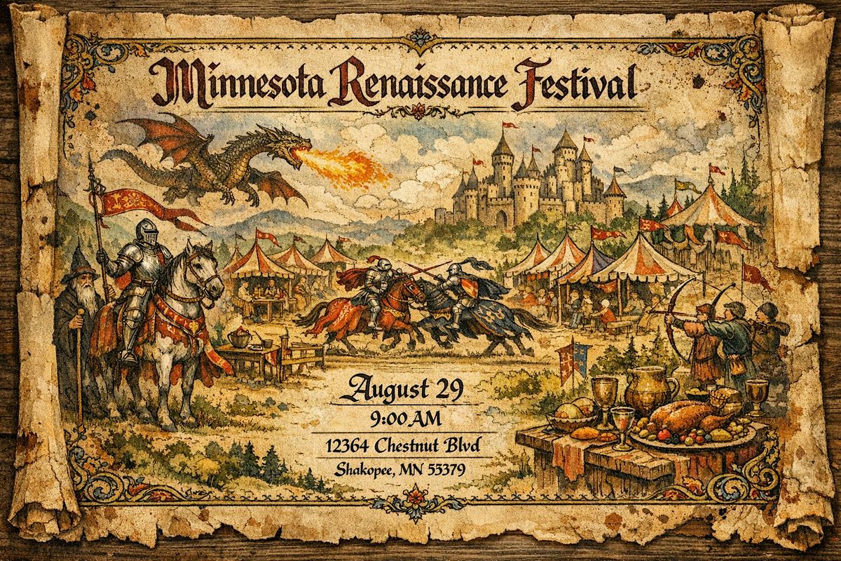 We’re putting together a group to go to the Minnesota Renaissance Festival together. Think knights, dragons, jousting, giant turkey legs, live performances, and a full medieval village. Costumes are encouraged but not required. Mostly this is just a fun excuse for everyone to go together instead of separately.