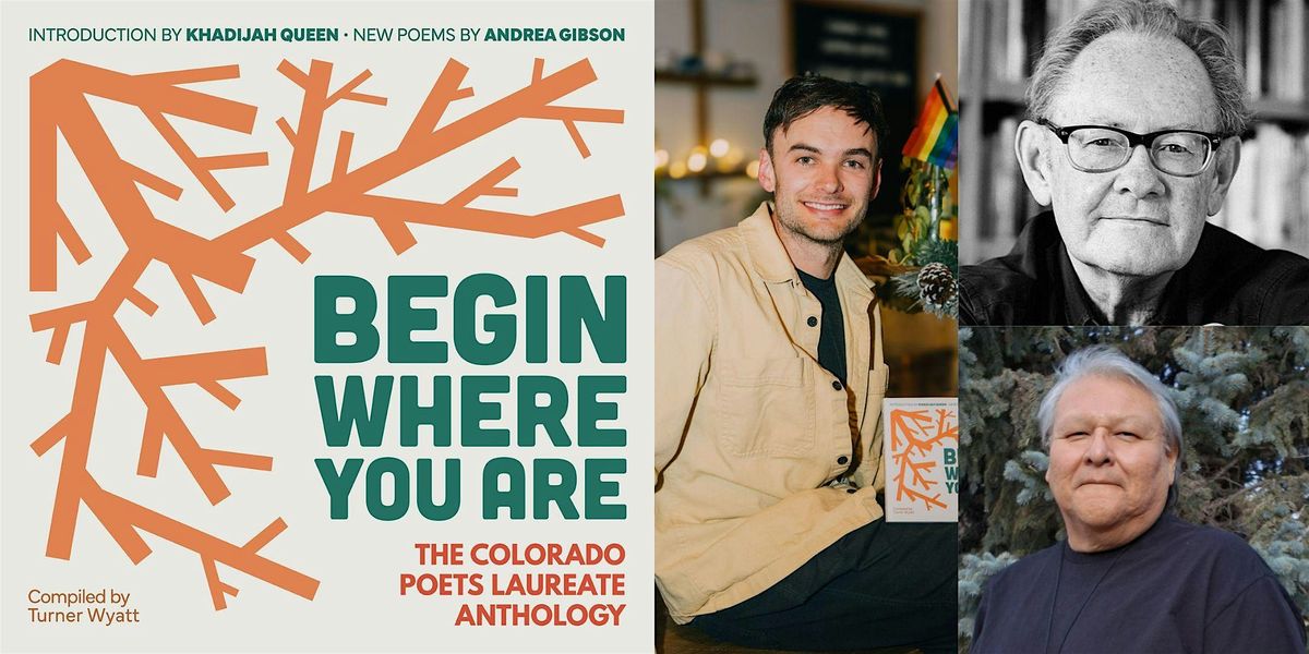Turner Wyatt, former Colorado Poet Laureate Joseph Hutchison, and current Colorado Poet Laureate Crisosto Apache will speak about and sign their new book, Begin Where You Are: The Colorado Poets Laureate Anthology, on Wednesday, April 15th at 6:30pm, at Boulder Bookstore.