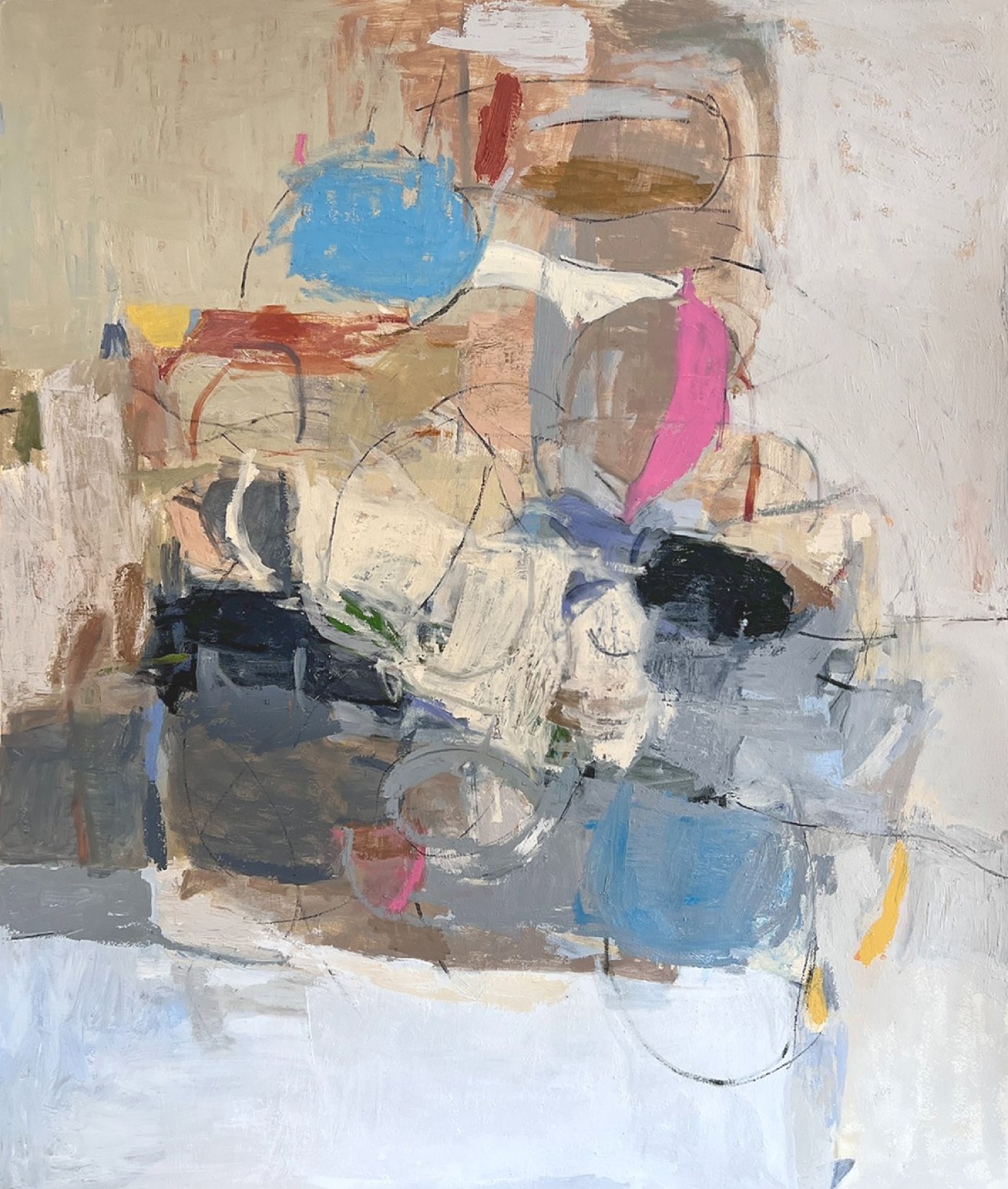 Lita Kenyon’s work explores abstraction’s ability to evoke balance and tension without relying on narrative. Kenyon avoids specific references, allowing meaning to emerge organically as images blend and shift within fields of color and gestural marks. Inspiration comes from nonobjective forms as they emerge in the composition. Kenyon’s process is guided by intuition-driven methods, where each piece begins with a gesture and evolves through scraping, repainting, and layering.