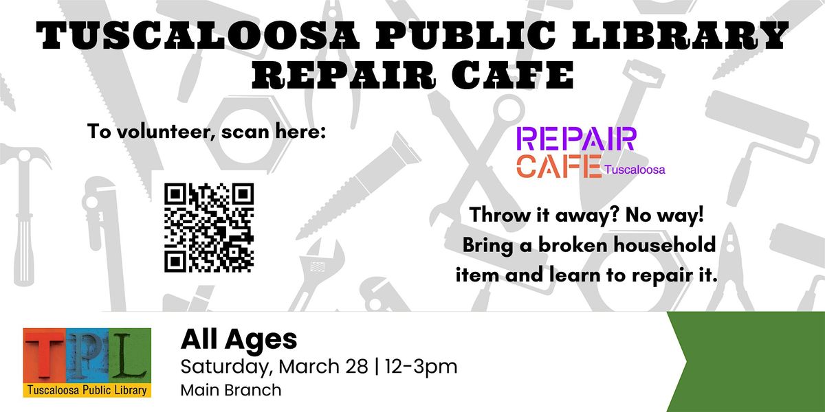 Tuscaloosa Public Library's Repair Cafe is where community members come together to fix, mend, and restore! Bring your broken household items, electronics, clothing, and more to our team of skilled volunteers who will assist you in repairing them.