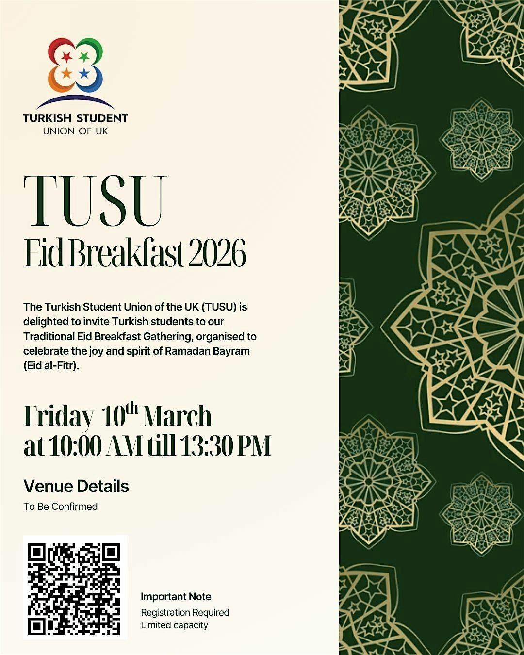 The Turkish Student Union of the UK (TUSU) is delighted to invite Turkish students to our Traditional Eid Breakfast Gathering, organised to celebrate the joy and spirit of Ramadan Bayram (Eid al-Fitr).