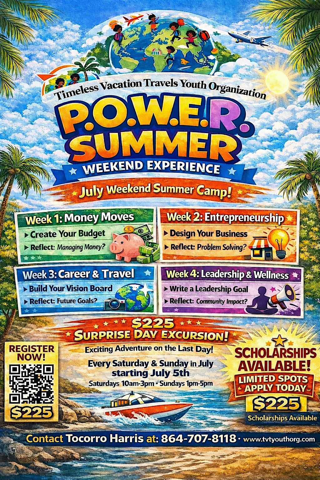 Every Saturday and Sunday in JULY starting July 5 (Saturdays 10am-3pm and Sundays 1pm-5pm) Timeless Vacation Travels Youth Organization is hosting the P.O.W.E.R Summer Weekend Experience Event for grades 6th through 12th, to empower youth through hands-on experiences in financial literacy, entrepreneurship, career exploration, leadership development, and mental wellness while exposing them to opportunities beyond their current environment. Please sign up and have the youth join us in empowering the next generation!