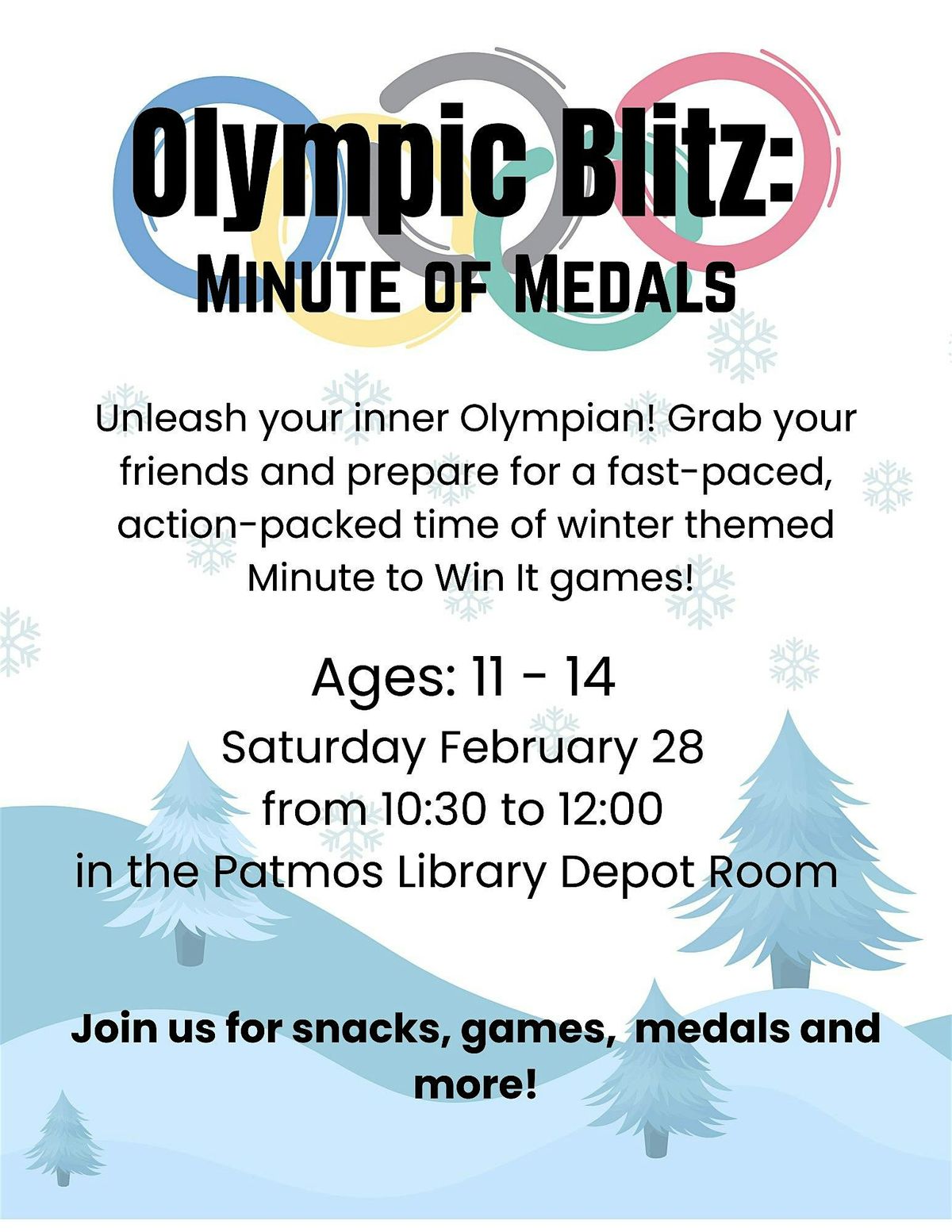 Join us at the Patmos Library for the Tween Olympic Blitz event! Get ready to showcase your skills and compete with fellow tweens on February 28, 2026 at 10:30 AM (Eastern Time). Let's see who will emerge victorious in this fun-filled competition. Don't miss out on the chance to be part of this exciting event at the library. This event is for kids ages 11-14. See you there!