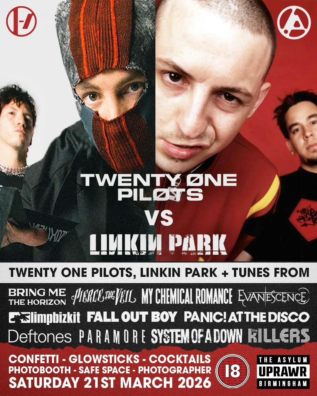 Twenty one Pilots vs Linkin Park Clubnight!Our second versus night of 2026 and we're throwing two bands together that we get more requests for than any other...Twenty One Pilots vs Linkin Park party coming 21st March 2026...Expect to hearSongs from EVERY Twenty One Pilots Era!Songs from EVERY Linkin Park Era!as well as the biggest hits from... Limp Bizkit / Bring Me The Horizon / Evanescence / Green Day / Sleep Token / My Chemical Romance / Panic! at the Disco / The Killers / Paramore / Fall Out Boy / Deftones / Papa Roach / Slipknot / Flyleaf / Pierce the Veil / Sleeping with Sirens / Motionless in White / Bad Omens / Enter Shikari / Don Broco / Blink-182 / Avril Lavigne / System of a Down / Korn / Eminem / Charli XCX / The 1975 / Tame Impala / Gorillaz / Muse / Arctic Monkeys / QOTSA / Foo Fighters / The Offspring / Creed / Nickelback / Nirvana / Nine Inch Nails and MORE! Plus★ Birmingham's Cheapest Bar★ Confetti★ LED Battens★ Photo Booth★ Signature 'Blood Bag' Cocktails★ Angel Wings and Devil Horns Photo Ops ★ Balloon Drop ★ Exclusive Cocktails ★ Safe Space ★ PhotographerGot an upcoming birthday / stag do / hen do and want to hire the VIP podiums? Email [email protected] BIRTHDAY FREE ENTRY If your the week leading up to or on the day of this event DM us on social media to learn how to get free entry !