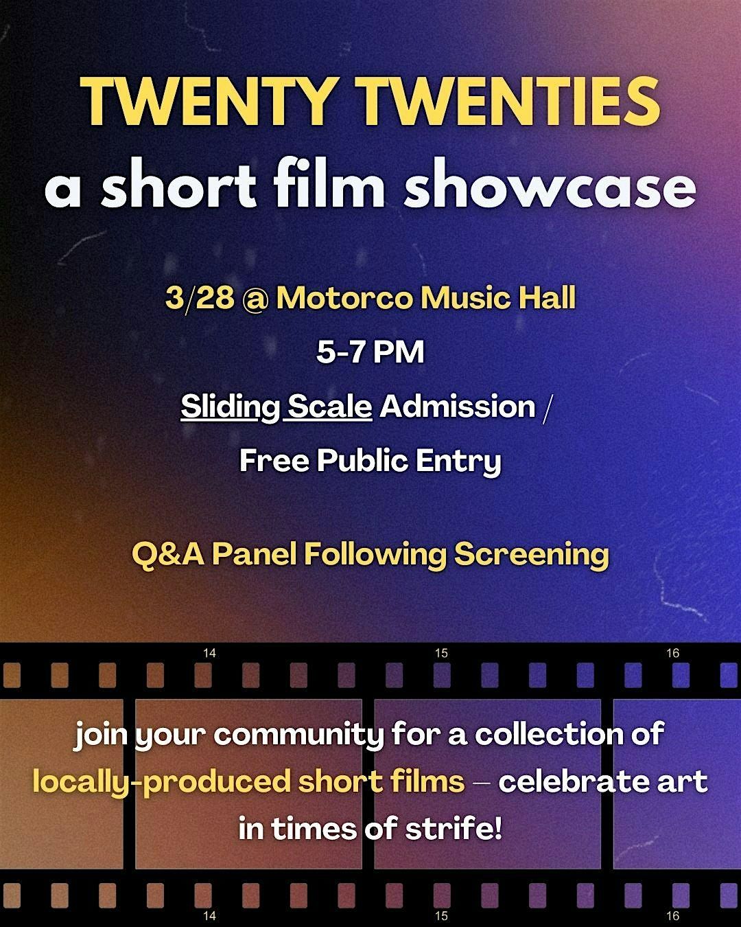 "Twenty-Twenties" is a vignette style web series of five short films that weave together in one story. The project will screen, accompanied by some surprise extra short films, on March 28th at Motorco Music Hall from 5-7PM.
