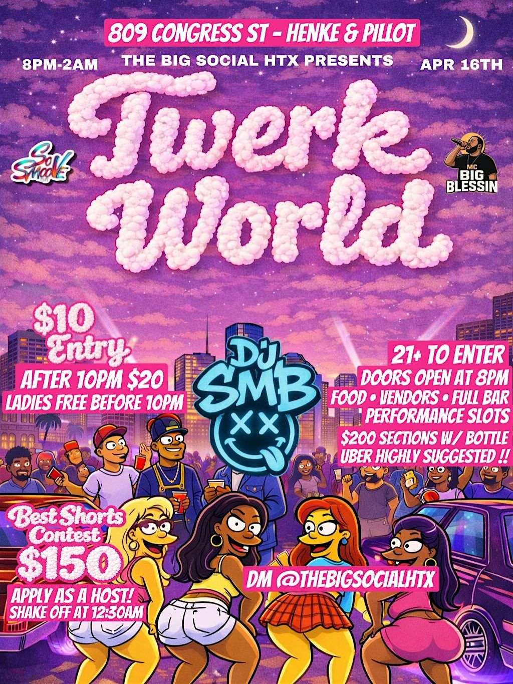 Join us in person for the wildest TWERK WORLD showdown ever! Bring your best moves and show off your skills in the SHAKE OFF CONTEST. It's gonna be a blast with great vibes, awesome people, and nonstop energy. Don't miss out on the chance to own the floor and have the time of your life!