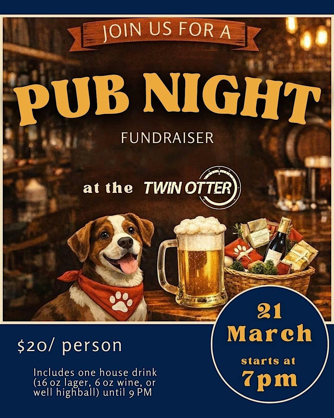 Come join us for a night out to raise funds for our animals in care! Ticket includes one house drink (16 oz lager, 6 oz wine, or well highball) until 9 PM and we will have a silent auction as well. See you there!