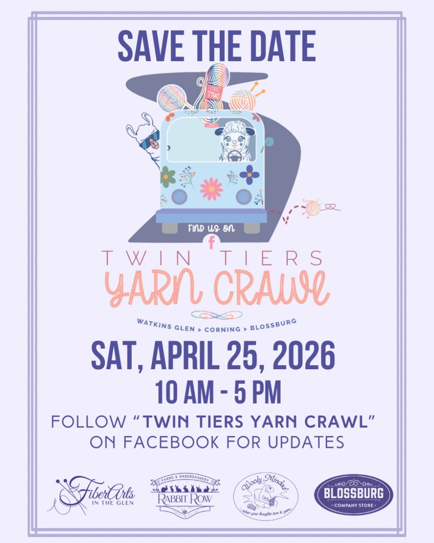 Four premier yarn shops across the Twin Tiers region are joining forces to host the fifth annual Twin Tiers Yarn Crawl on Saturday, April 25, 2026, from 10:00 AM to 5:00 PM.