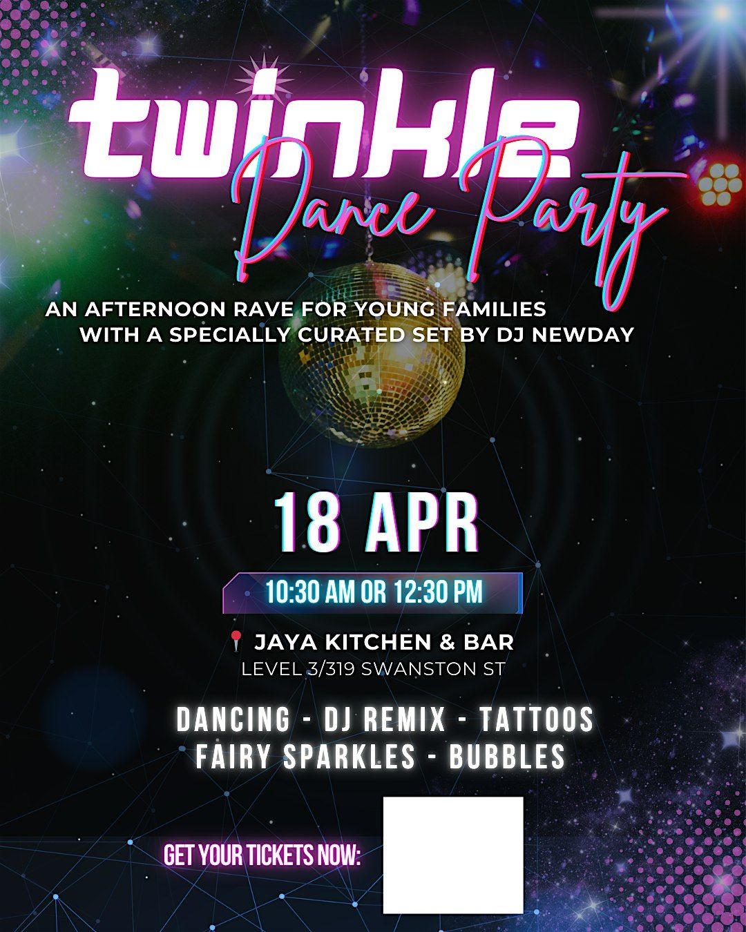 Twinkle Dance Party is a rave-style experience with music, twinkling lights, drinks, and fun activities throughout the session. Every child is different — have a think about your little one and whether they’ll enjoy this high-energy environment.