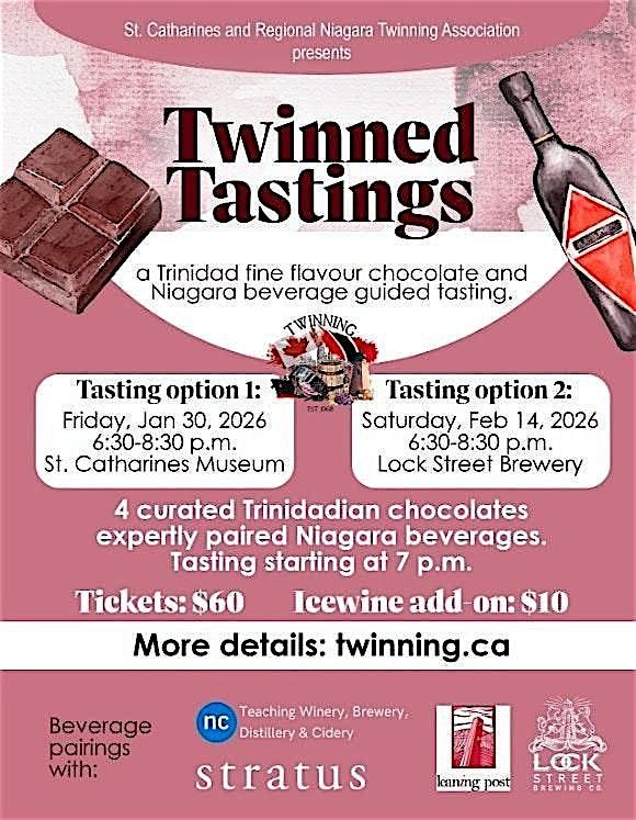 A guided tasting event of Trinidadian fine flavour chocolate with Niagara Beverage. Taste 4 pairings of curated Trinidadian Chocolate with a variety of Niagara wines and locally produced beer from Niagara College Teaching Winery, Stratus Vineyards, Leaning Post Winery and Lock Street Brewery.