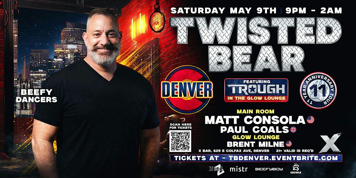 On Saturday May 9th... International bear party TWISTED BEAR is teaming up once again with TROUGH for an all-night take-over of Denver's infamous X BAR on Colfax...! Come and join us to celebrate TWISTED BEAR's 11th Year Anniversary Spring Tour.