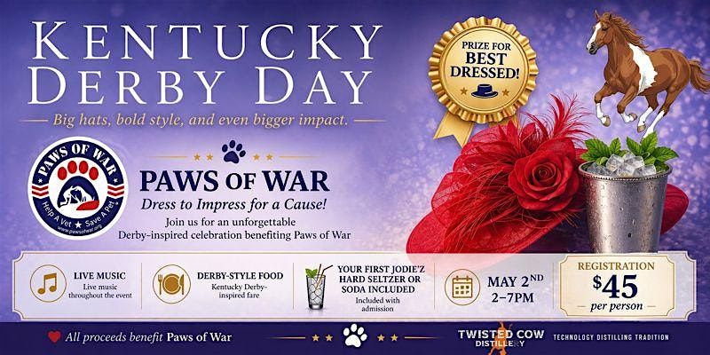 Get ready for a fun-filled day at at Twisted Cow Distillery in Northport for a Kentucky Derby Style event. Join us to celebrate the thrill of the race while supporting Paws of War, a great cause. Don your best derby hat, grab some friends, and enjoy an unforgettable experience with us! One drink and derby style food included in your ticket! Live music! Support our veterans, active duty military and first responders at this event.