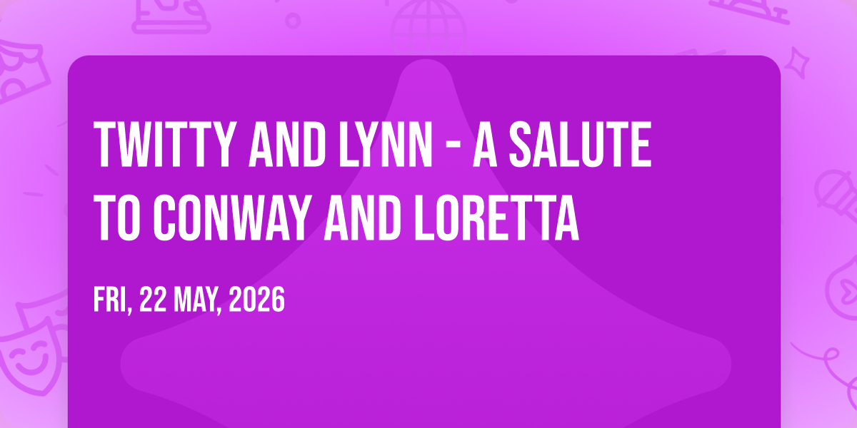 📍 Location: 41.6668, -85.583✨ Enter a world of endless possibilities at Twitty and Lynn - A Salute to Conway and Loretta, where every moment tells a story! 🏛️ The stunning Blue Gate Performing Arts Center in vibrant Shipshewana, IN transforms into a realm of wonder on May 22nd, 2026 at 11:30 PM. 🌟 They have crafted an experience that goes beyond the ordinary, combining elements of surprise, delight, and pure entertainment. Every detail has been thoughtfully considered to ensure your journey with us is nothing short of extraordinary. 🎯 Join fellow adventure seekers and memory makers in this celebration of imagination and innovation. 🎊 Reserve your spot today and be part of something truly special!