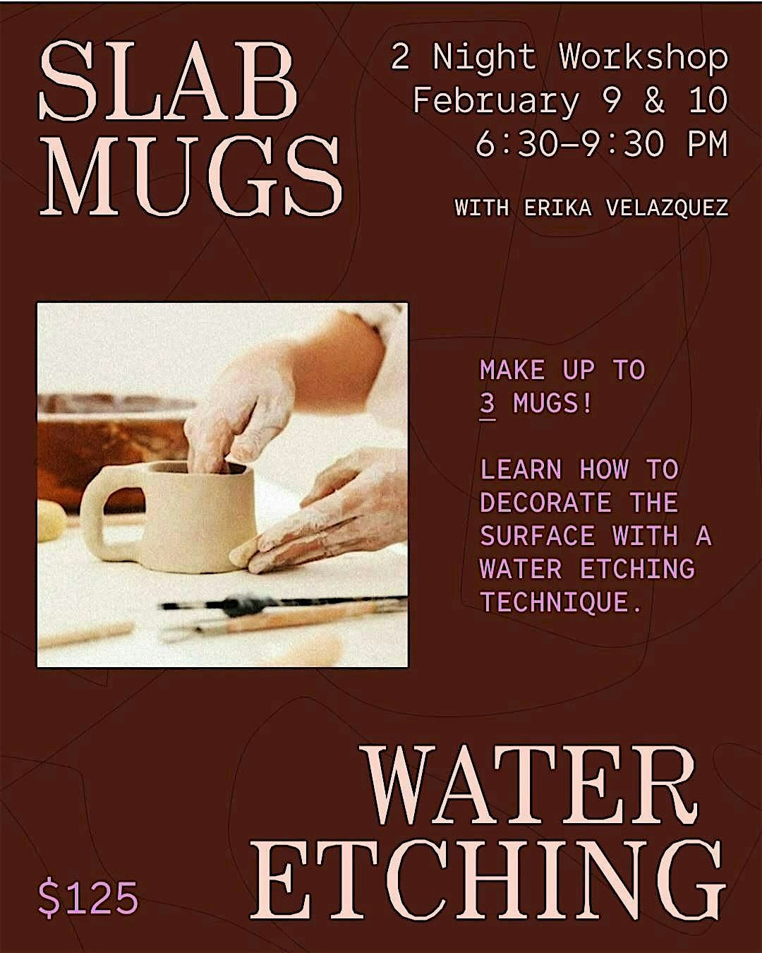 On day 1, students will learn how to slab build their mugs. On day 2 of the workshop, after the mugs have dried to the leather hard stage, students will learn how to apply their design to their mugs with a water etching technique.