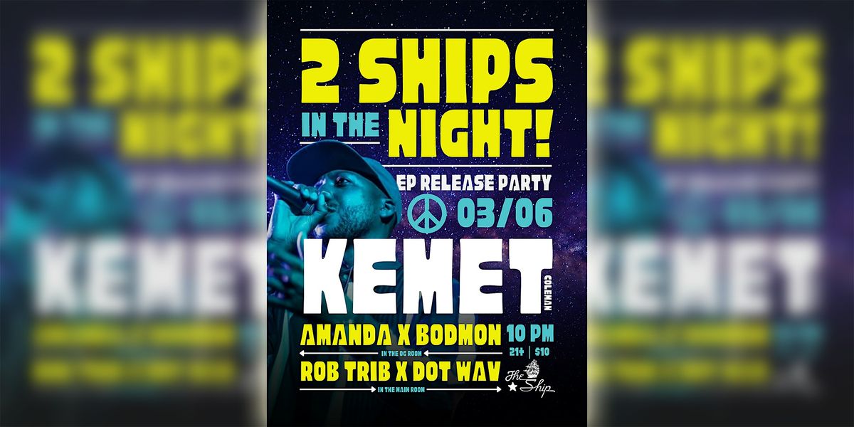 Kemet Coleman is throwing a party to celebrate the release of his new EP, "Two Ships in the Night". He'll be performing the EP live, with Amanda x Bodmon holding down the OG Room and Rob Trib x Dot Wav in the main room, so both rooms will be moving.