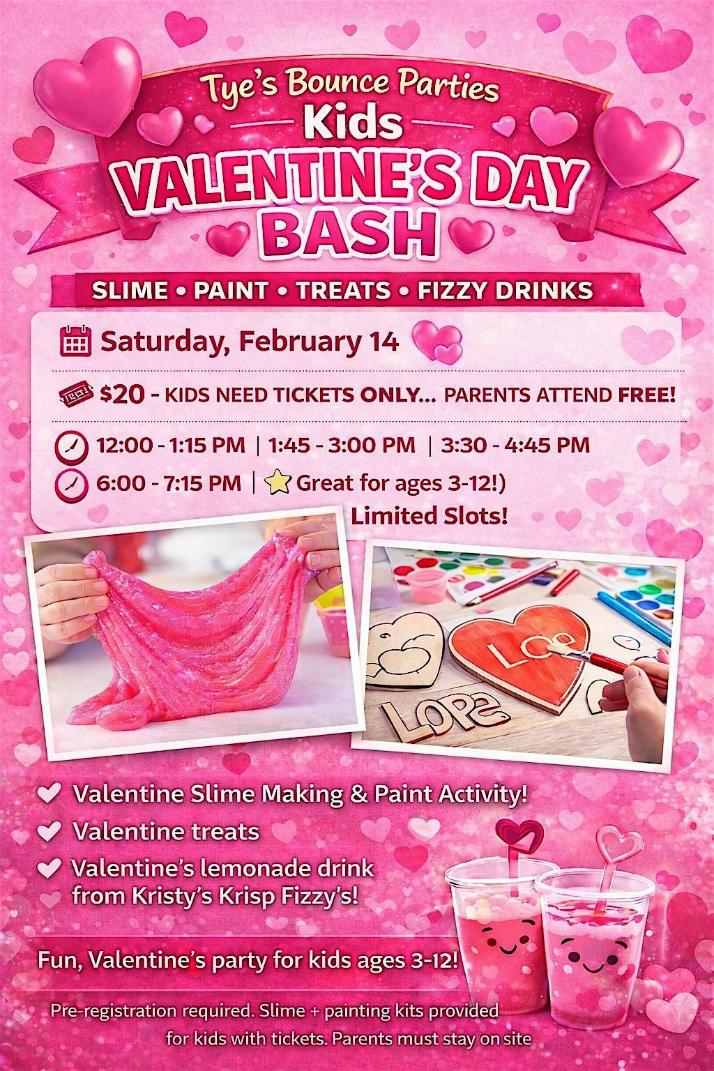 Jump into fun with Tye’s Bounce Parties Kids Valentine’s Day bash—bounces, games, and sweet treats!About this Event
