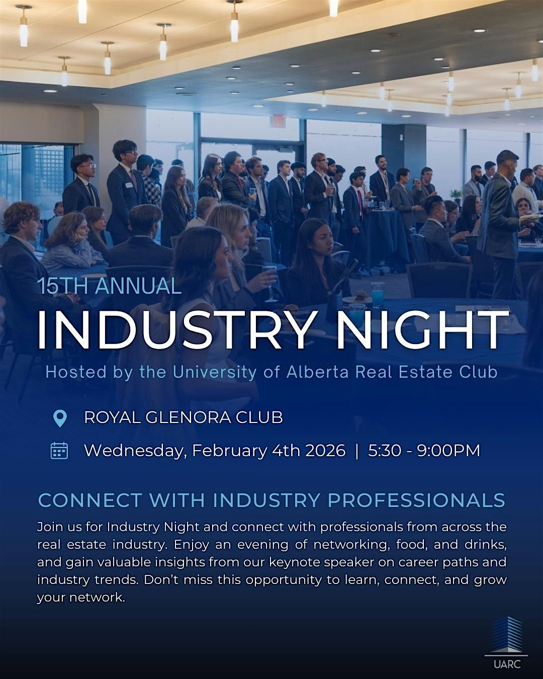 Join us for the 15th Annual Industry Night, hosted by the University of Alberta Real Estate Club, at the prestigious Royal Glenora Club. This signature event brings together students and professionals from across the real estate industry for an evening focused on meaningful connection and career development.
