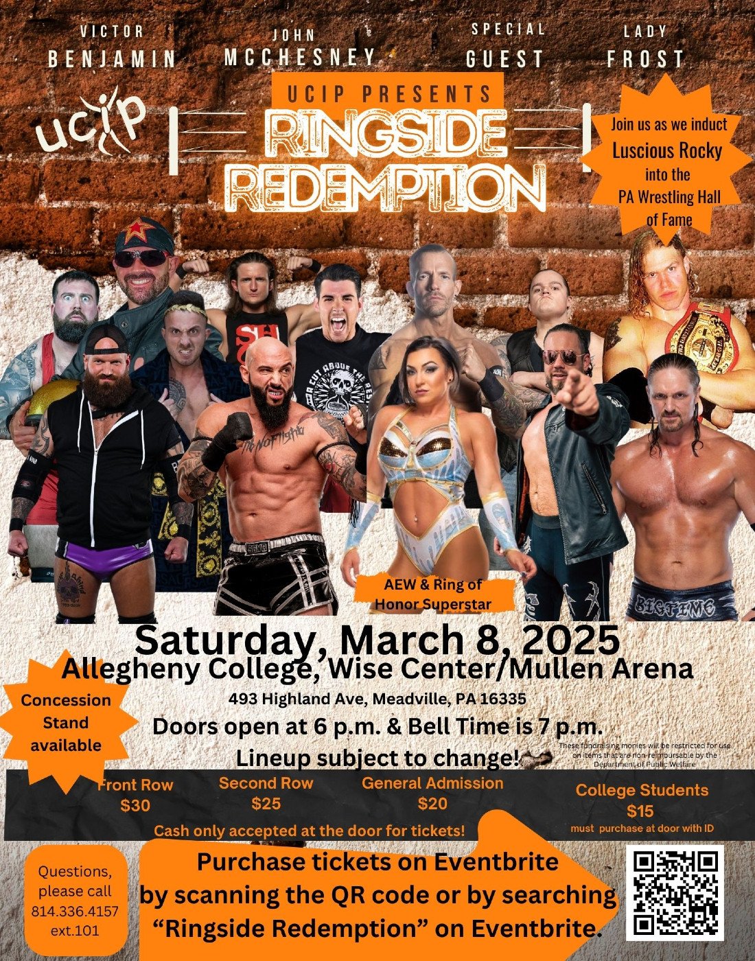 UCIP presents the ultimate showdown at Allegheny College Mullen Arena in the Wise Center! Get ready for an action-packed night filled with intense matches and electrifying moments. Whether you're a die-hard fan or just looking for a fun night out this event is sure to deliver non-stop excitement. Don't miss out on the thrill of Ringside Redemption!