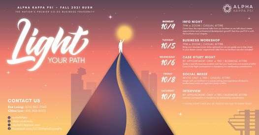 The brothers of Alpha Kappa Psi cordially invite you to attend our Fall 2021 Hybrid Rush: ?LIGHT YOUR PATH!? Join us on Week 2 of Fall Quarter for 5 days of getting to know our lovely active members, valuable insight from esteemed alumni speakers, professional development, and good vibes. ? ? INFO NIGHT (10/4 @7pm on Zoom): Come hear the inspirational talks from our brothers as we talk about career opportunities and professional development growth! See how you'll fit in with the brothers from our chapter : ) | CASUAL ATTIRE